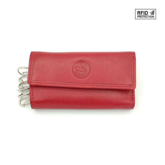 Porte-clés crochet mousqueton, RFID (système anti-piratage des cartes crédits), porte-monnaie à fermeture au dos, cuir vachette lisse collet avec boite.