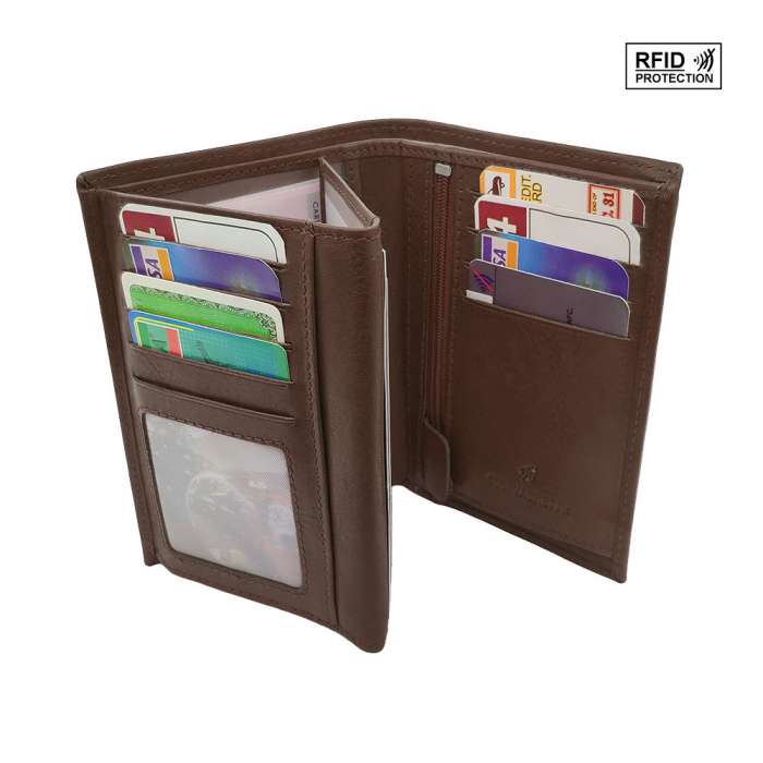 Portefeuille format moyen 3 volets identité et permis, RFID (système anti-piratage des cartes crédits), fermeture pour la monnaie, cuir vachette lisse collet avec boite.